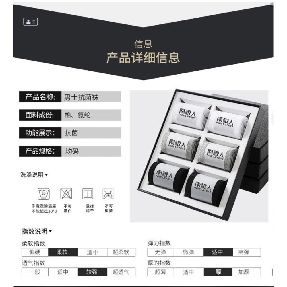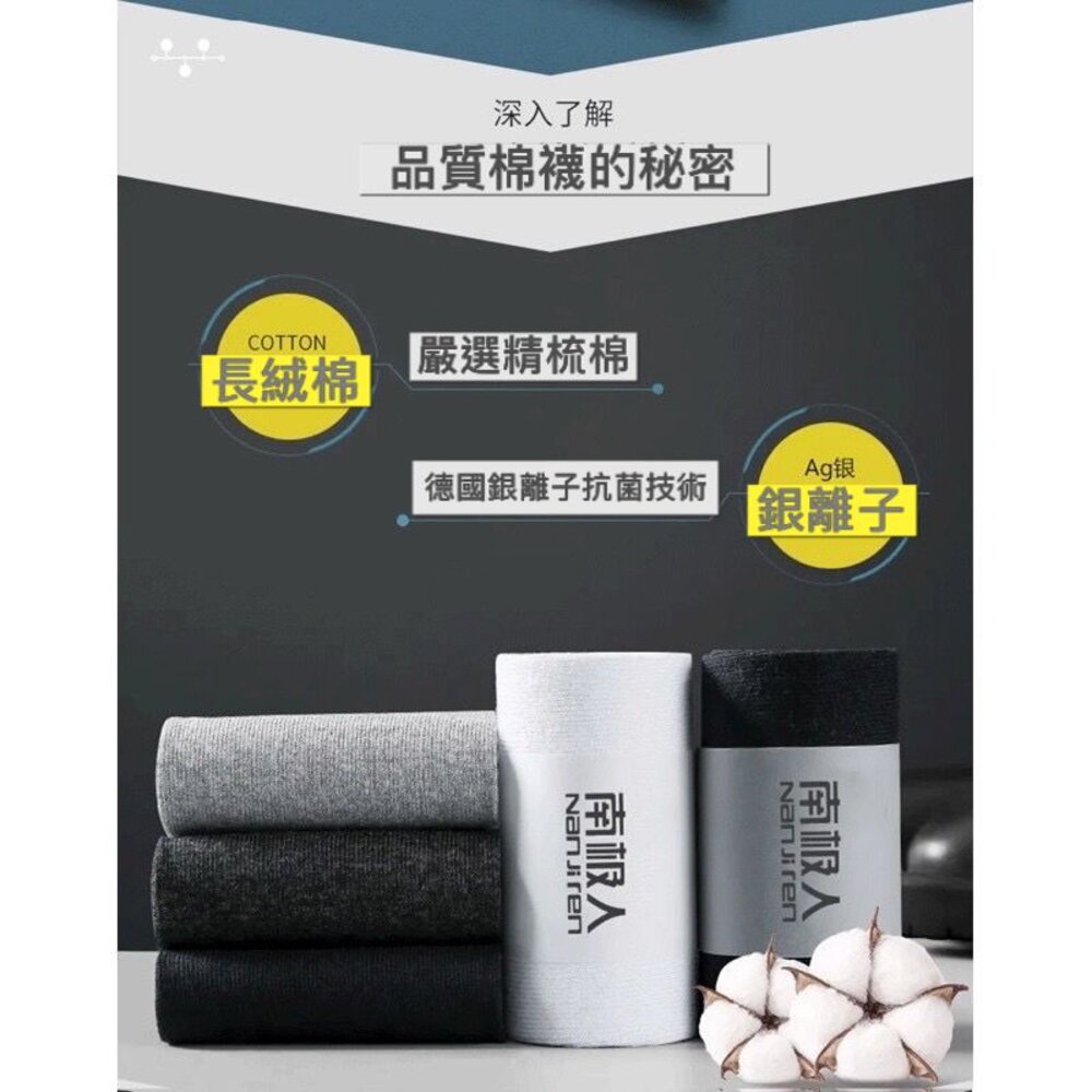 紡織大廠南極人授權工廠直輸 科技抗菌除臭襪 $精品批發價$ 規格:五雙袋裝 (環保夾鏈袋) 功能:德國銀離子抗菌襪 成分:精梳棉+銀離子Ag 特色:銀離子除臭、 純棉透氣、 彈性舒適、 耐穿不起毛 尺碼:男襪均碼(39-44)